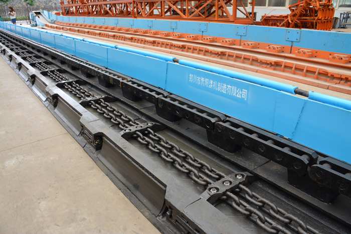 刮板輸送機在是采煤工作面和采區(qū)巷道運煤布置的機械,起到了連續(xù)輸送的作用。其工作原理是將敞開的溜槽,作為煤炭、矸石或物料等的承受件,將刮板固定在鏈條上(組成刮板鏈),作為牽引構(gòu)件。當(dāng)機頭傳動部啟動后,帶動機頭軸上的鏈輪旋轉(zhuǎn),使刮板鏈循環(huán)運行帶動物料沿著溜槽移動,直至到機頭部卸載。刮板鏈繞過鏈輪作無級閉合循環(huán)運行,完成物料的輸送。